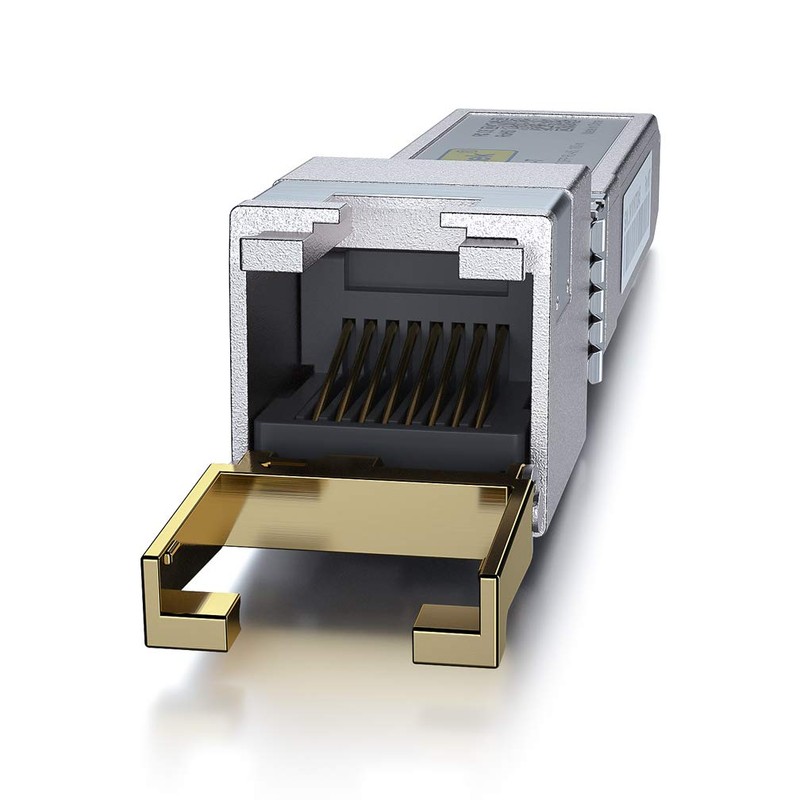 The 10G-SFP-T copper transceiver module is a high performance integrated duplex data link for bi-directional communication over copper cable. It is specifically designed for high speed communication links that require 10 Gigabit Ethernet over Cat 6a/7 cable. This is the first SFP+ transceiver that offers 10 Gb/s communication over this type of media.