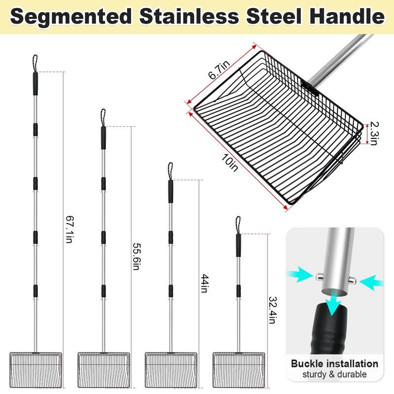 - Adjustable & Sturdy Stainless Steel Handle: The chicken poop scooper features an adjustable stainless steel handle(32" 44" 55" 67"), allowing you to customize the length for comfortable cleaning in chicken coops of all sizes. The scoop head made with iron wire and 201 stainless steel handle, metal ensures durability, making this metal coop scoop a long-lasting tool for daily coop maintenance.