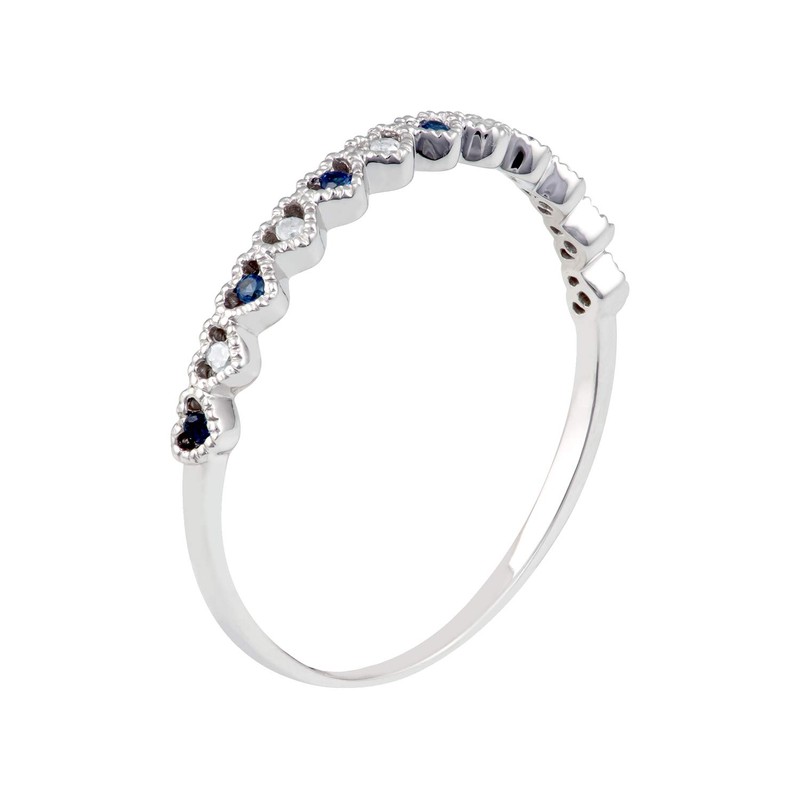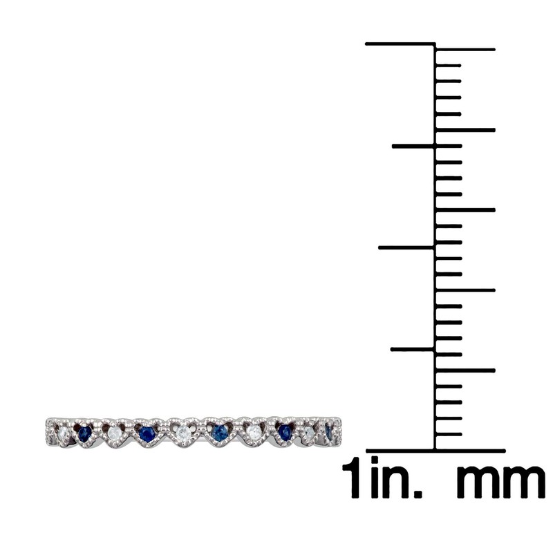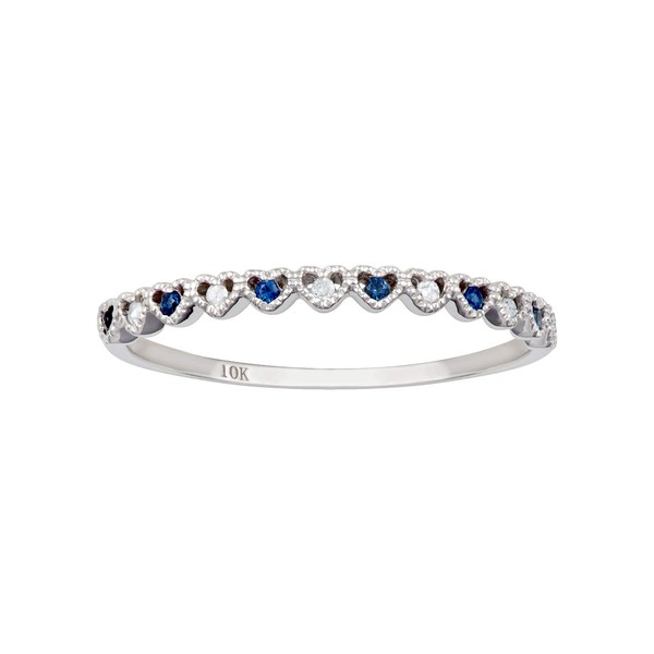 Enhance any wardrobe with this beautiful sapphire and diamond stackable band. This band showcases alternating genuine blue sapphires and white diamonds on a thin band with heart shaped pattern. Crafted of 10k white gold, this piece is a wonderful addition to your jewelry collection.