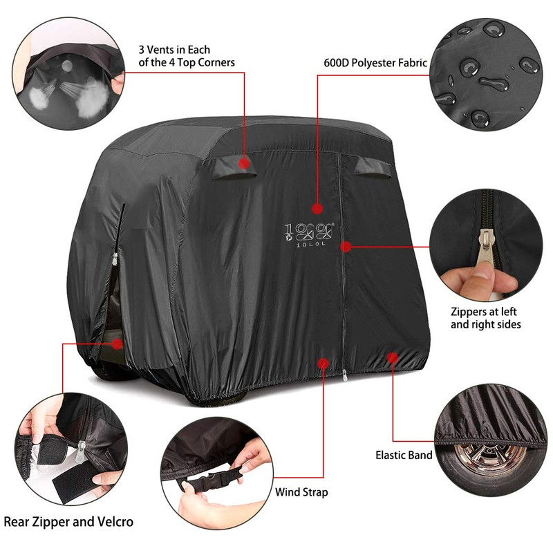 - With 4 air vents, keeps mold and mildew from accumulating, your cart will remain breathable and dry. The left, right and rear door zippers make it easy in/out access to golf cart without removing the cover
