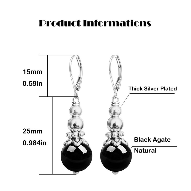 10mm Natural Black Agate Stone Bead Dangle Earrings,Retro Silver Real Quartz Crystal Gemstone Boho Bohemian Drop Earrings Beading Jewelry for Women (A07_Black Agate)
