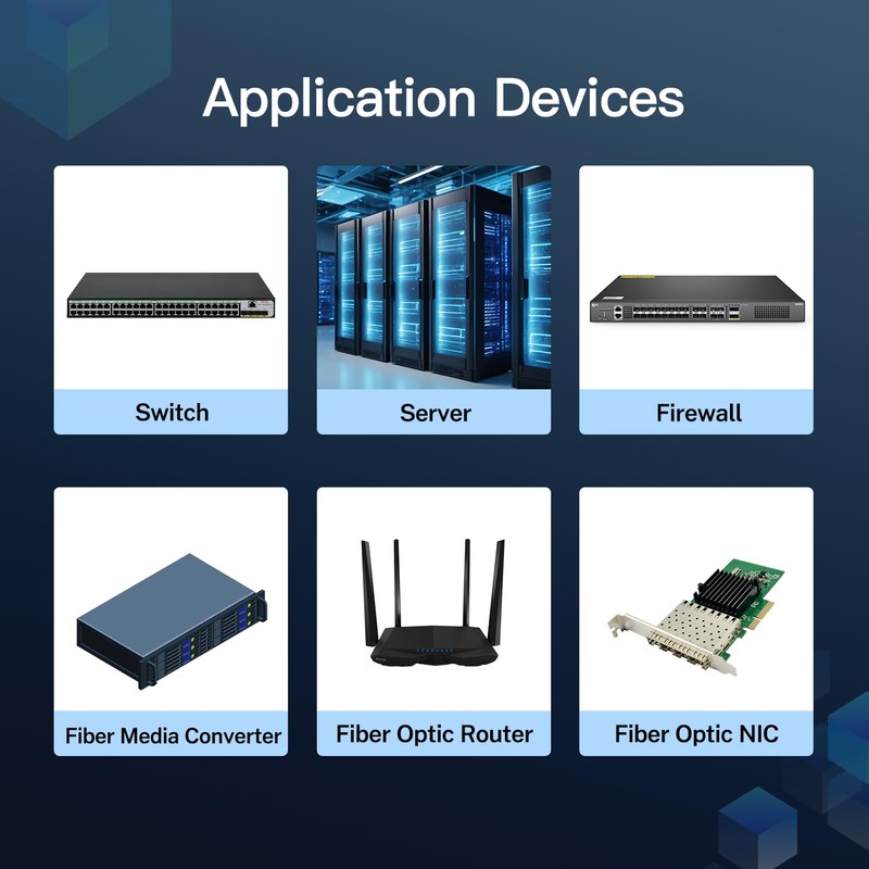 - 4. Wide Application Scope: Suitable for enterprise networks, data centers, and home network setups alike. It supports both 62.5um and 50um LC fiber cables and is compatible with OM1, OM2, OM3, and OM4 fiber types, meeting the connectivity requirements of diverse 1Gbps SFP port-equipped devices.