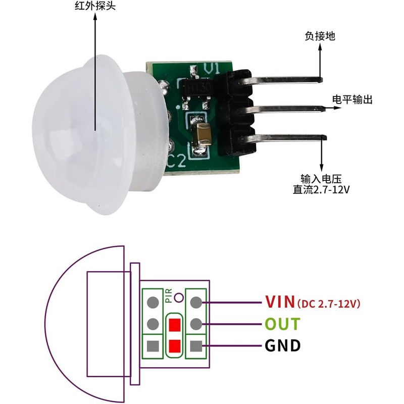 - 【Specific Parameters】Working voltage: DC 2.7V - 12V; Static power consumption: <0.1mA; Delay time: 2 seconds, blocking time: 2 seconds; Trigger mode: repeatable; Sensing range: less than or equal to 100 degrees cone angle, 3 - 5 m (depend on the specific lens); Working temperature: -20 degrees Celsius to +60 degrees Celsius.