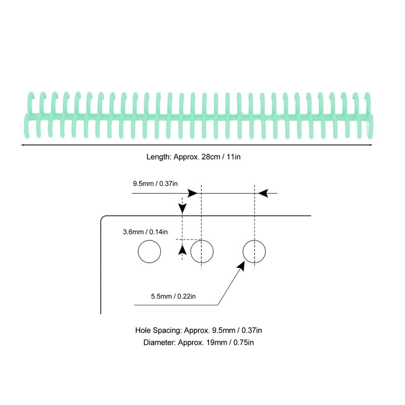• Specification: This binding spine features 30 rings design, with a diameter of 19mm, hole spacing of 9.5mm, single length of 28cm, and maximum binding capacity of 150 sheets of 70g paper.