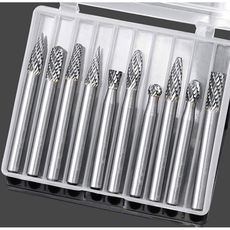 - 【EASY TO USE】10 pcs Carbide Rotary Burr Set with 1/4-inch shank size, compatible with most die grinders or rotary tools. Suitable for all skill levels: this is a essential kit for metalworkers & enthusiasts who cleans up welds or works with metal frequently, easy to grasp and use, safe and reliable.