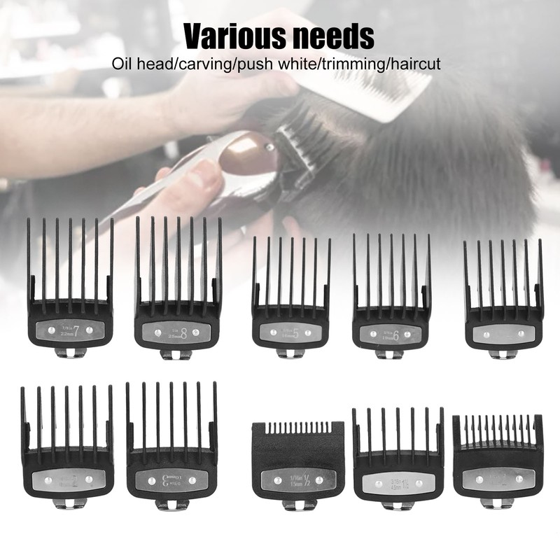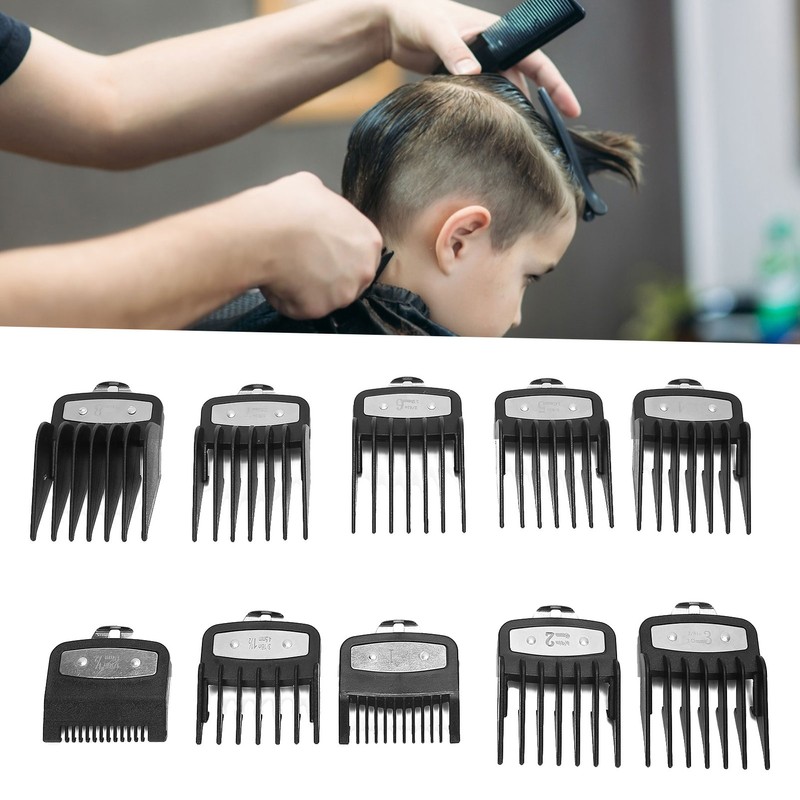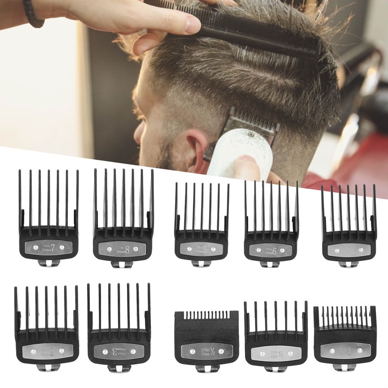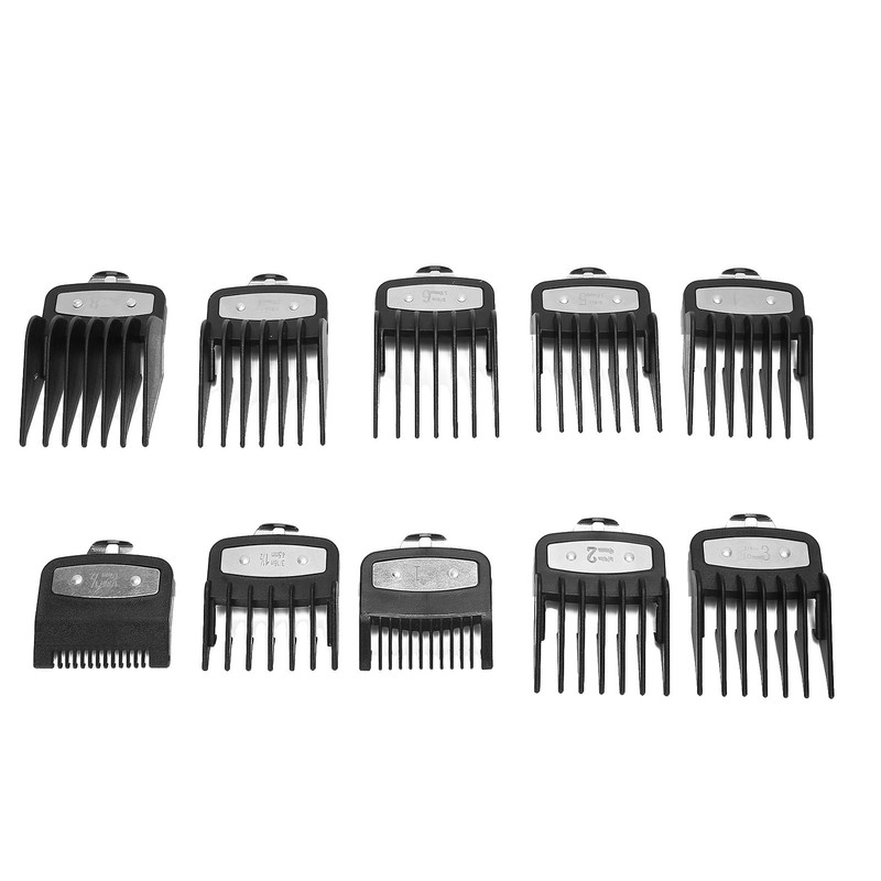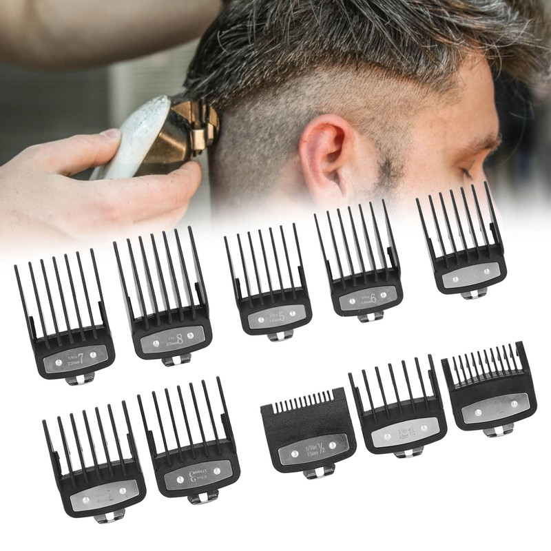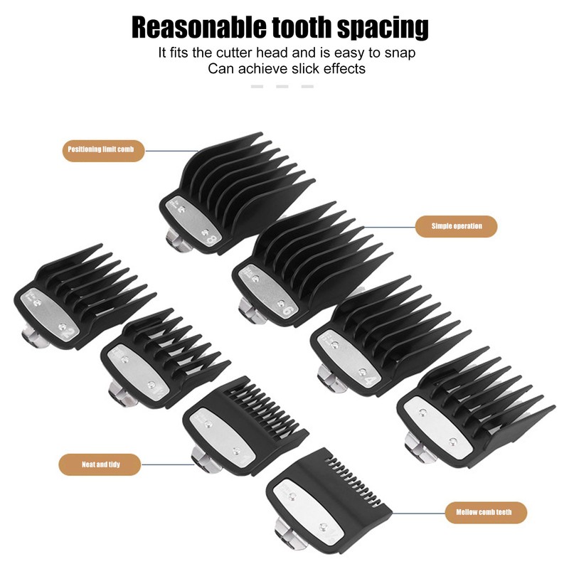 1、There are 9 different sizes of guide combs, you can freely choose the size you like. 2、The mellow comb teeth can prevent scalp injury and are safe and comfortable to use. 3、These hair clipper guide combs are made of high‑quality materials and are super easy to install and remove. You only need to fix the comb on the hair clipper blade and push to fix it. 4、Light weight, small size, can be easily put in the bag, heat‑resistant, convenient and practical. 5、Each guide comb is printed with a number, make hair styling easy, simple control of haircut length.