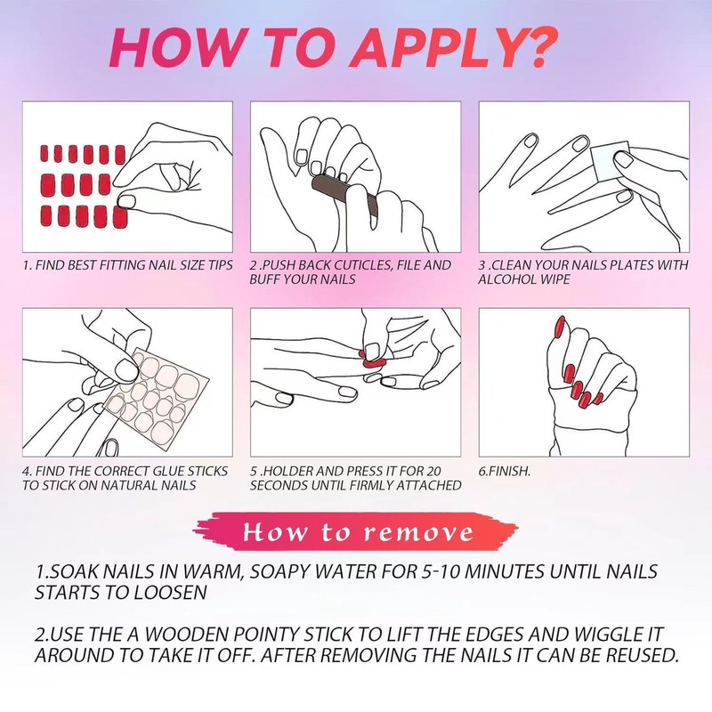 - đăPackage ContentsăPress-on nails (10 pcs), a nail remover stick, a jelly gel,a nail glue,a nail file. â»Please refer to the product picture for how to measure and choose the size. Small/Medium/Large 3sizes for option, Please be sure to measure your size carefully before ordering; An Almost accurate size table, allows your nails to fit at a high level, and wear more comfortably.