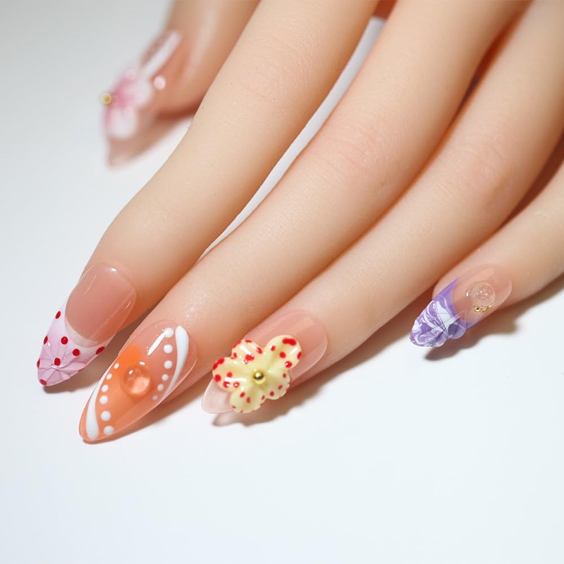 10Pcs Handmade Reusable Almond press on nails | Misty Floral Cluster with Pink-Orange-Purple 3D Embossed Polka Dots & Pearls, For Women & Girls, Daily & Party Wear(FlowerA19, M)