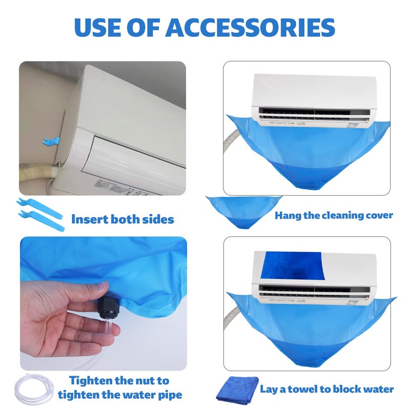 - Easy to Use: Hang the air conditioner cleaning cover, connect the water pipe and the cleaning cover, spread the towel on the top of air conditioner and you can start clean. Please pay attention to not wetting the circuit part.