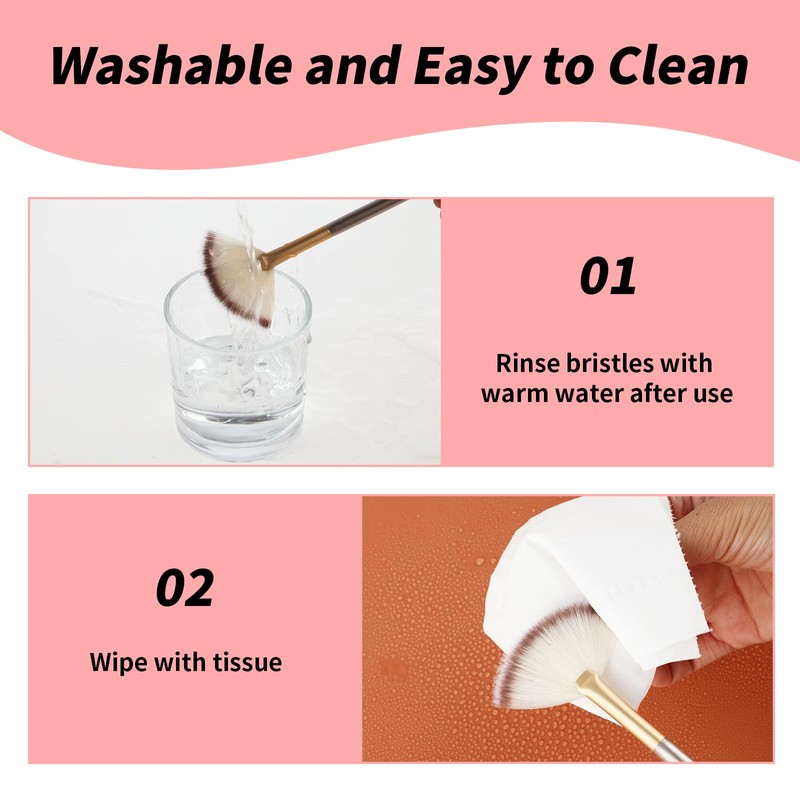 - Easy to Clean: Fan brushes can rinse with warm water after use, and the handle surface Coating layer makes it very easy to clean after use. After washing, gently press the bristles with tissue, after draining the water, put the brush tilt down in a ventilated place to dry, it can be reused