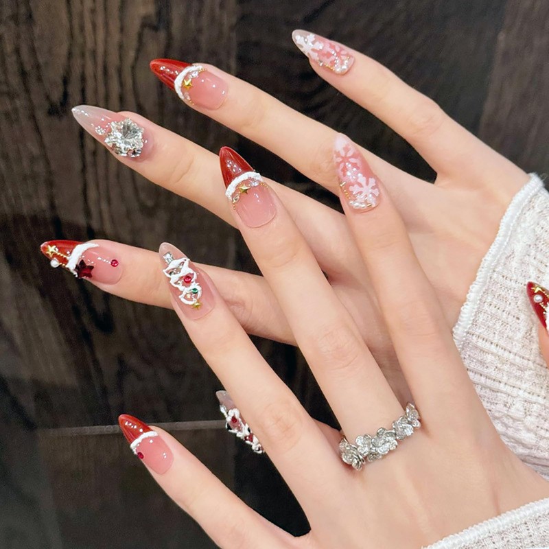10Pcs Red French Tip Press on Nails Handmade Christmas Fake Nails with Christmas Tree Snowflake Star Design Christmas False Nails Handmade Almond Nails Press ons Artificial Glue on Nail for Women (S)
