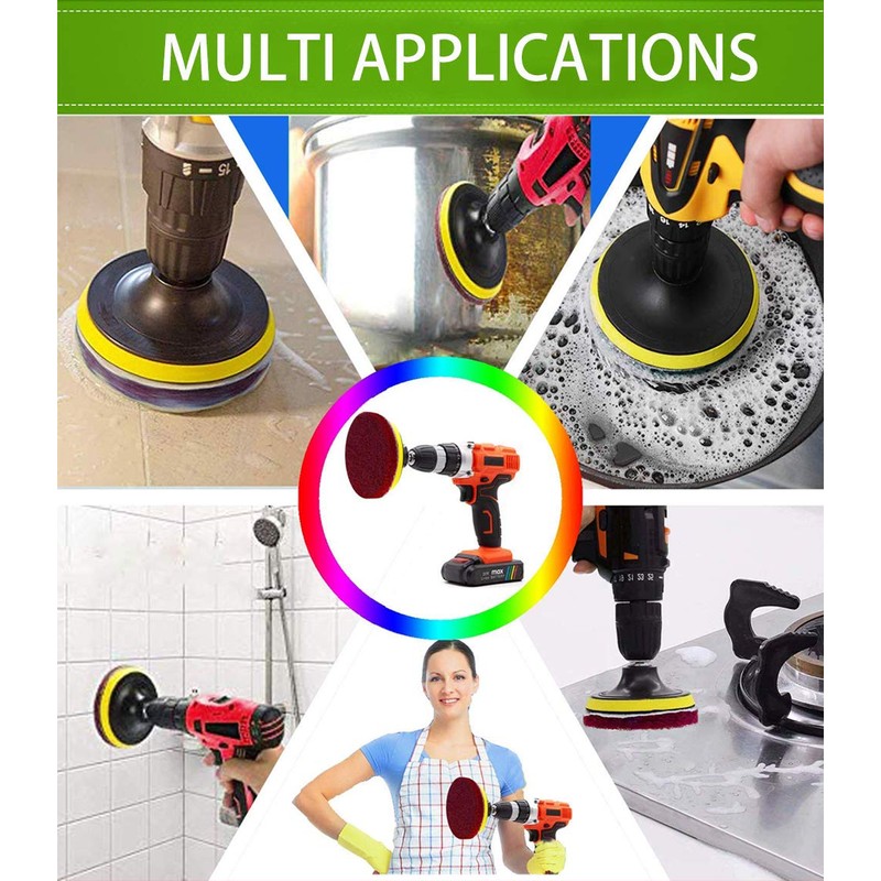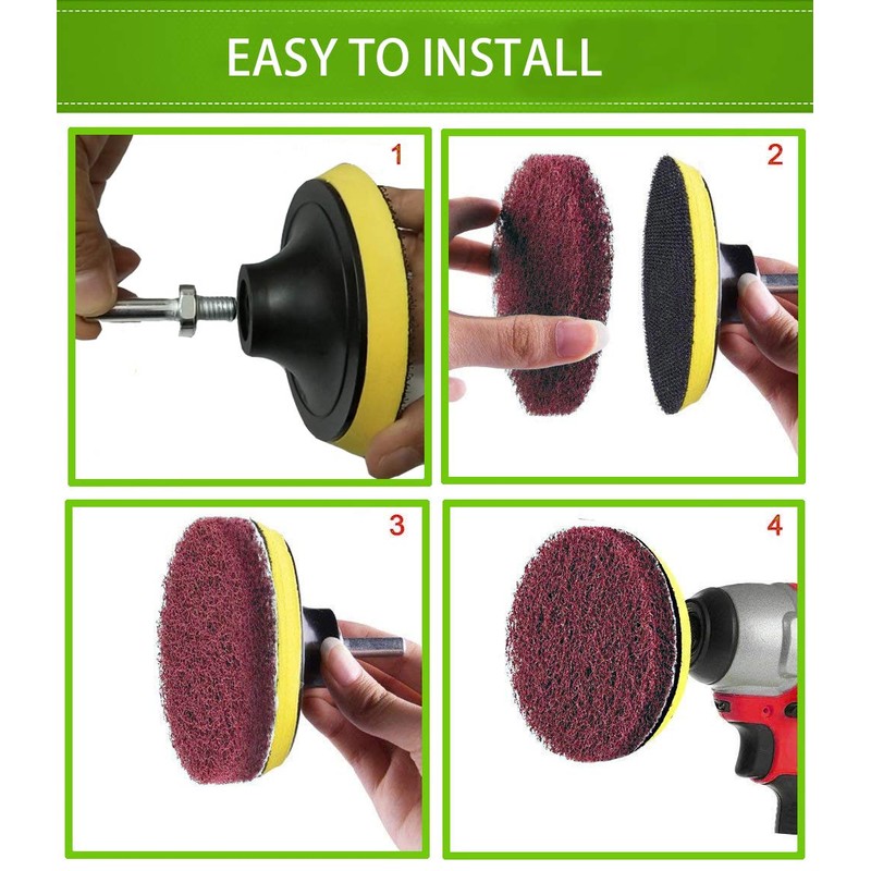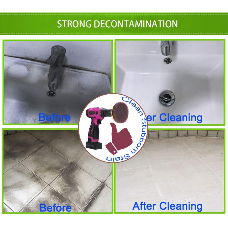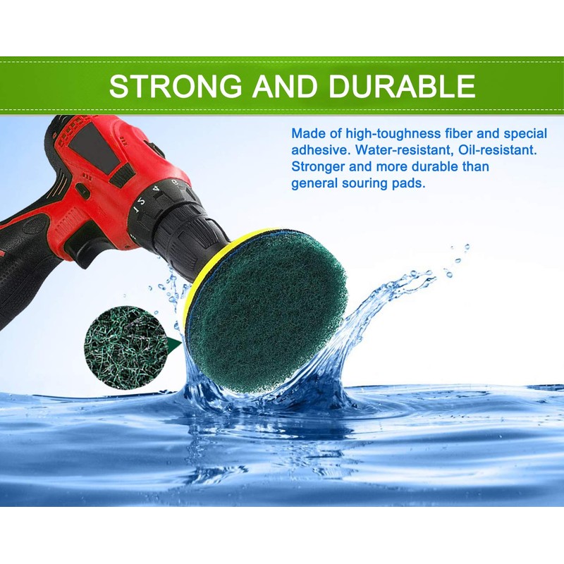 - TIME AND EFFORT SAVER: Attach this heavy duty scrub pad to your cordless drill or electrical screwdriver, turn on the power, high speed rotary scouring pad can easliy remove any kind stotain stains. Such as hard water stain, soap scum. Easer and faster than scrub by hand.