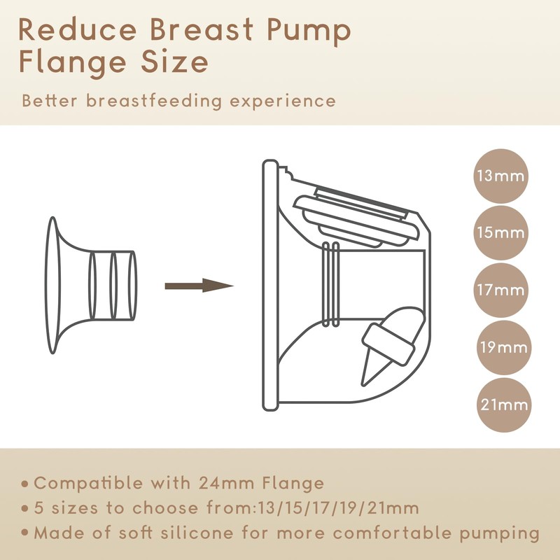 - LUXEMUM shield covers and flange inserts help you find the perfect fit for your nipples. Flange inserts 13/15/17/19/21mm (10pcs) can reduce the 24mm shield nipple tunnel to the correct size (13mm/15mm/17mm/19mm/21mm), adapting to changes during different physiological stages for better breast expression. (Please note: Not suitable for 27mm shield covers).