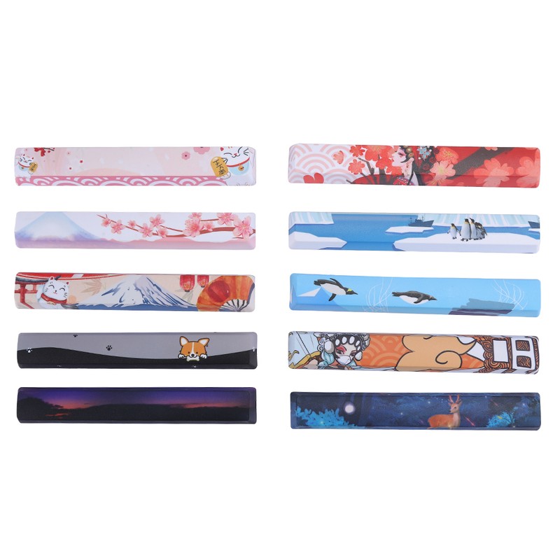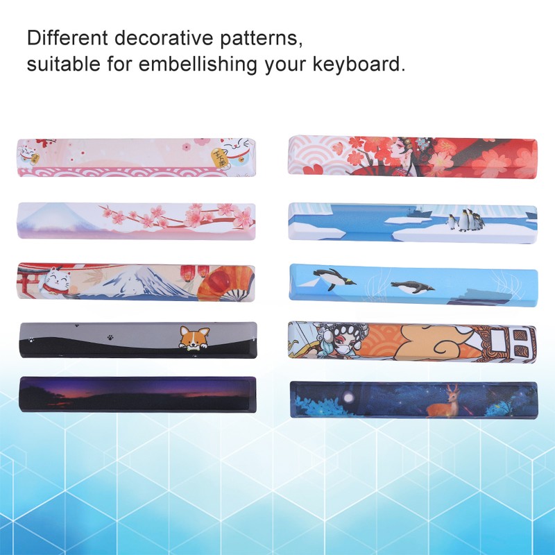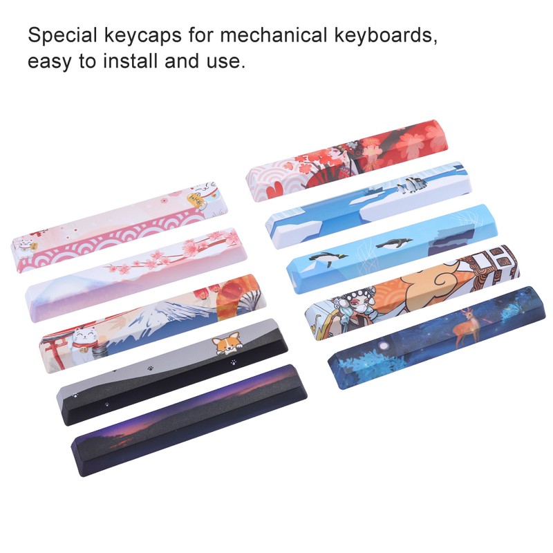 1、With different decorative patterns, it is very suitable for embellishing your keyboard. 2、Five-sided dyed keycaps, rich in color, high color fastness, and no fading. 3、Special keycaps for mechanical keyboards, there are 10 space keycaps to meet your needs. 4、Selected high-quality PBT materials, with good texture, wear resistance and long-term use. 5、Professional manufacturing, superb workmanship, easy to install and use.