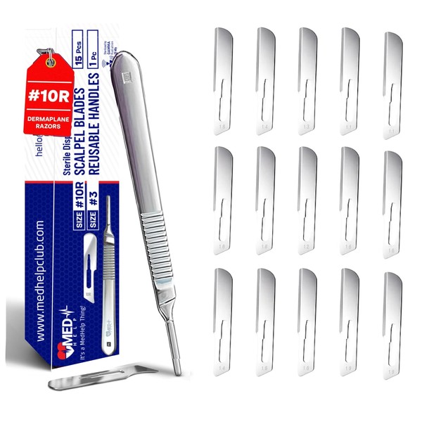 - [GENEROUS PACK OF 15 blades #10R + 1 handle] While your other DISPOSABLE SURGICAL SCALPEL may be too dull, not sharp enough, not sterile, flimsy or difficult to use, MedHelp brings a HIGH QUALITY CARBON STEEL scalpel sterile that is SAFE and EASY to use, having a plastic protection cap and a LIGHT ERGONOMIC handle. This means a YOUNGER BRIGHTER face for you and lots of other skin problems solved.