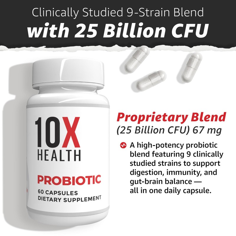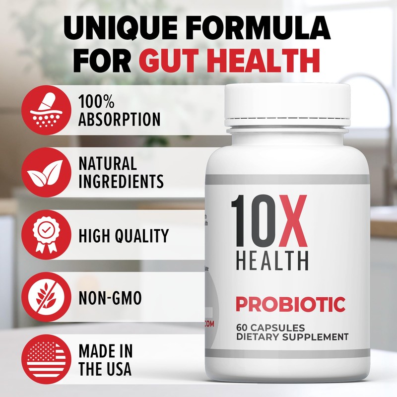 • Stomach Comfort and Regularity: Enjoy a smooth move with 10X Health probiotic capsules. The proprietary blend of probiotics supports digestion and may help prevent constipation, but it also supports less bloating and stomach discomfort after meals.