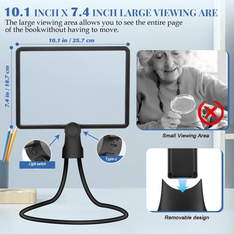 - USB Charging Design: This magnifier for reading supports fast charging, 1 hour full charge, endurance up to 6-8 hours, eliminating the need for frequent battery replacements, more economical and environmentally friendly, allowing you to use more peace of mind and more convenient.