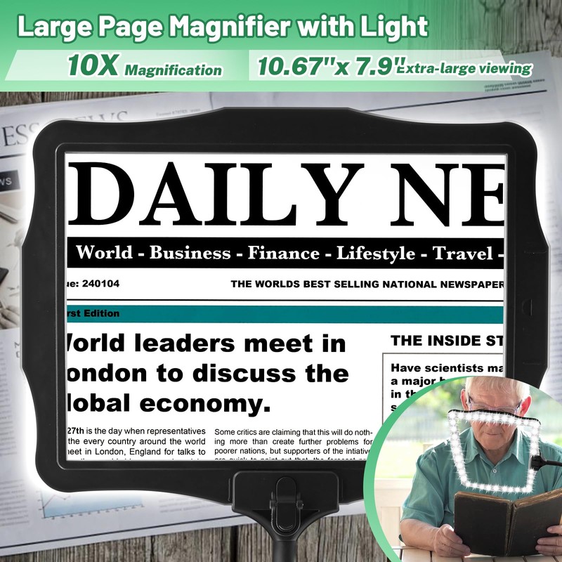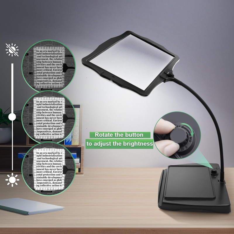 - Large Magnifying Glass: this large magnifying glass with light and stand lens size of 10.7inch ✖️7.9inch, large field of view area allows you to magnify the entire page of the book without frequent movement, with an adjustable bracket to fix the lens so you do not need to hand-held to use, free your hands!