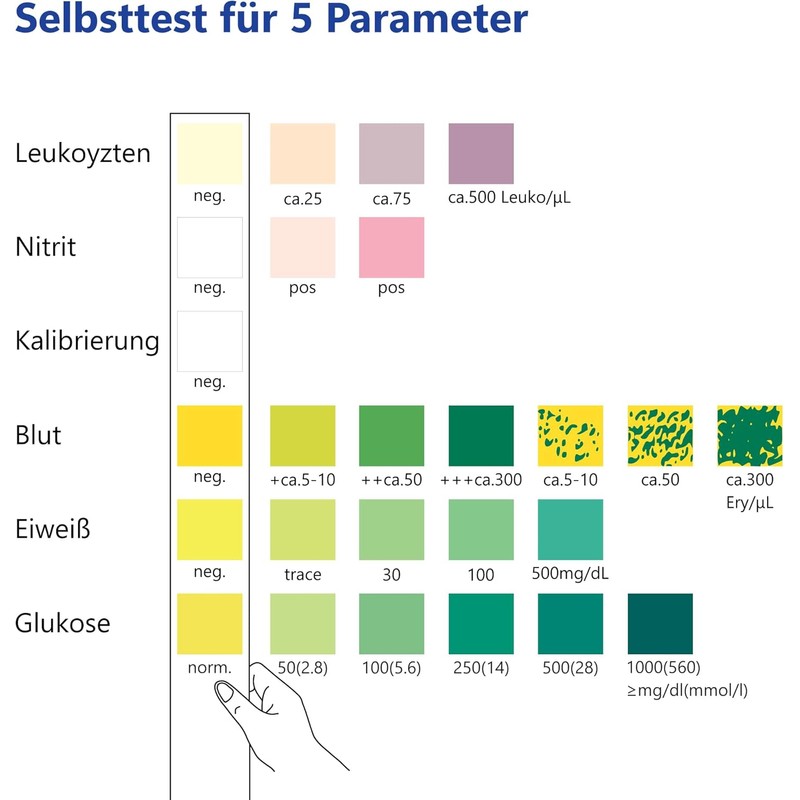 - Tests for 5 parameters – Our urine test strips offer an overview of 5 health parameters: glucose, white blood cells (leukoytes), red blood cells (erythrocytes) nitrite and protein.