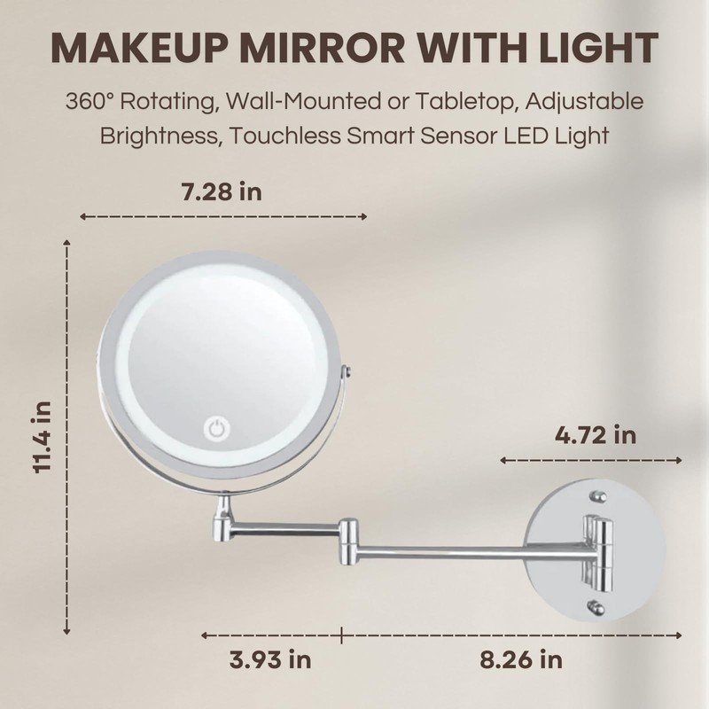 10X Magnifying Makeup Mirror with Lights – Touchless Sensor LED Vanity Mirror, Dual-Sided, 360° Rotating, Wall-Mounted or Tabletop, Adjustable Brightness