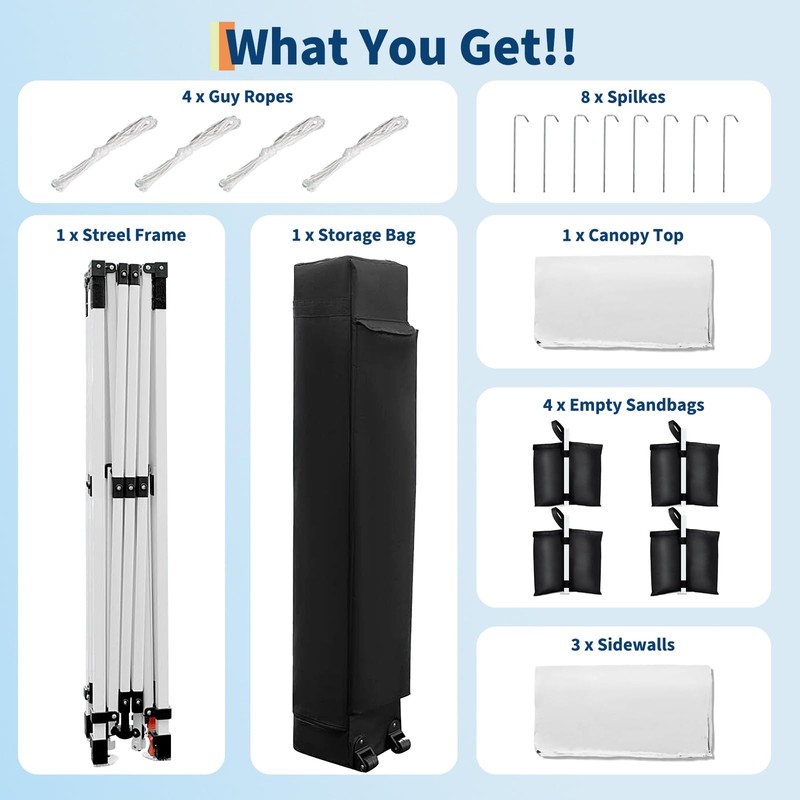 • Packing List: This canopy tent package includes: 1 steel frame, 1 canopy top, 4 guy ropes, 4 empty sandbags, 8 spikes, and 1 newly-designed storage wheel bag. If this 10x10 pop-up canopy does not meet your outdoor needs, we provide excellent after-sales service and are dedicated to addressing any issues or questions you may have
