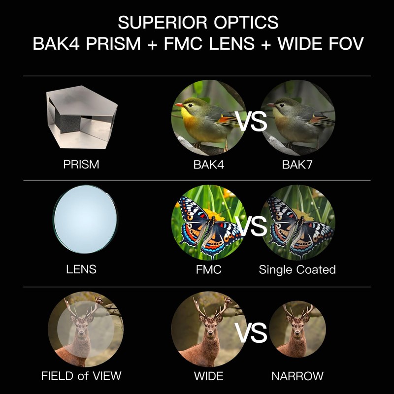 - 【Premium ED Glass & BAK4 Prisms for Enhanced Clarity】 Equipped with extra-low dispersion (ED) glass and high-quality BAK4 prisms, these binoculars minimize distortion and enhance sharpness. The advanced optical system ensures clear, high-contrast images, making them perfect for birding, wildlife observation, and long-range viewing in both bright and low-light conditions.