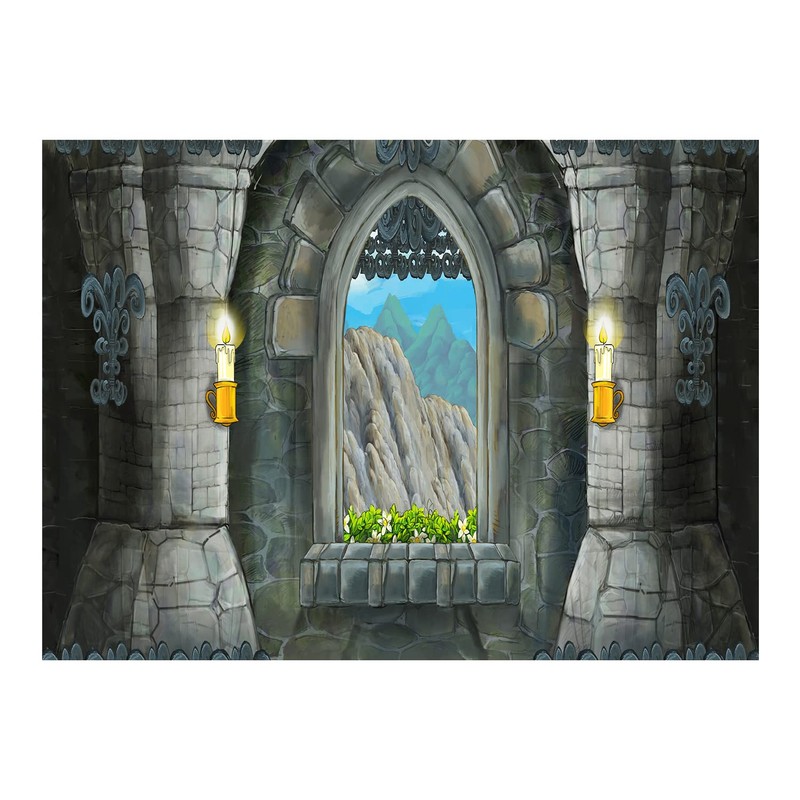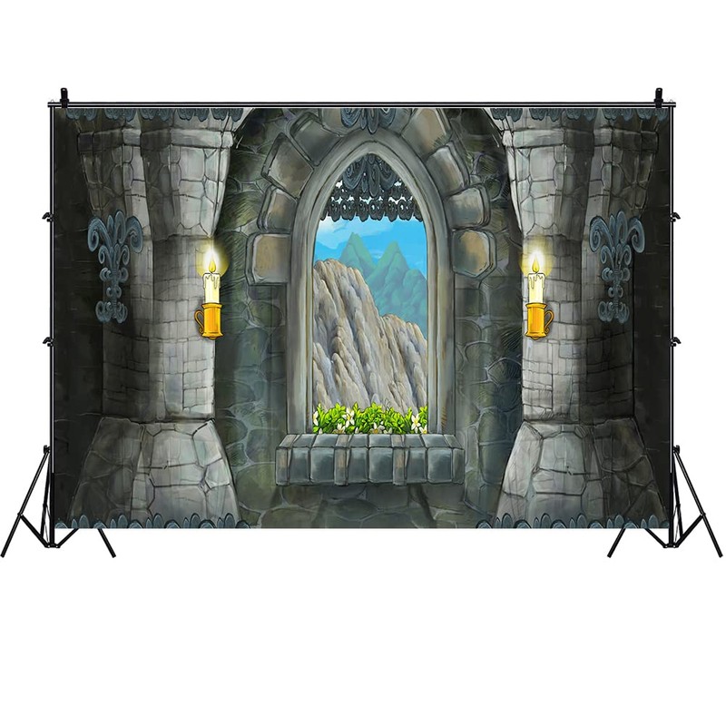 10x8ft Cartoon Fairytale Photography Backdrop Old Castle Vinyl Rustic Arch Stone Window Candles Flowers Remote Mountains Background Photo Shoot Landscape Wallpaper Studio Props