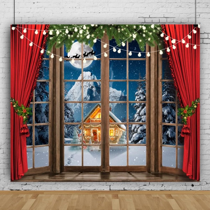 10x8ft Christmas Large Backdrop for Photography Red Curtain Winter Wonderland Santa Xmas Tree Rustic Wooden Window Photobooth Background Snow Bokeh Party Banner Decor Baby Family Holiday Supplies