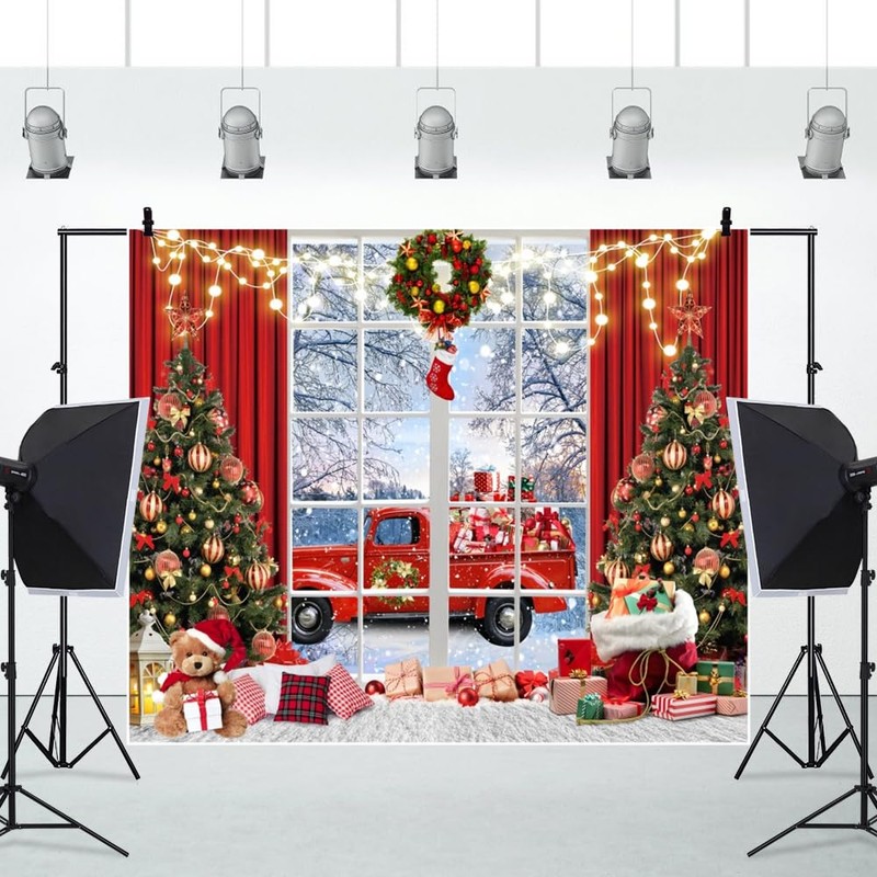 10x8ft Vinyl Christmas Photography Backdrops Xmas Window Photoshoot Backdrop Xmas Tree Snow Scene Red Car Wreath Light Background New Year Xmas Party Background Banner Supplies Photo Booth Props