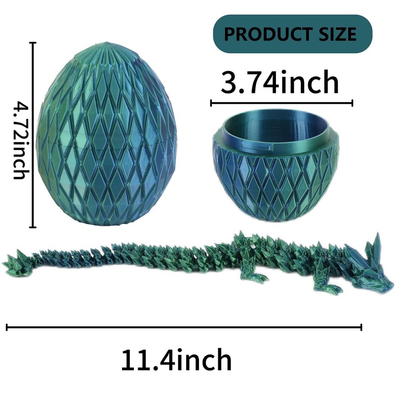 • Each FIDGET DRAGON EGG WITH DRAGON INSIDE is crafted with precision using the latest 3D PRINTING technology. The hidden ARTICULATED DRAGON with movable parts offers an engaging experience, making it an excellent choice for both children and collectors who appreciate the novelty of DRAGON EGGS WITH DRAGON INSIDE.