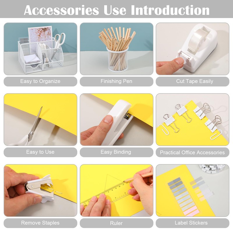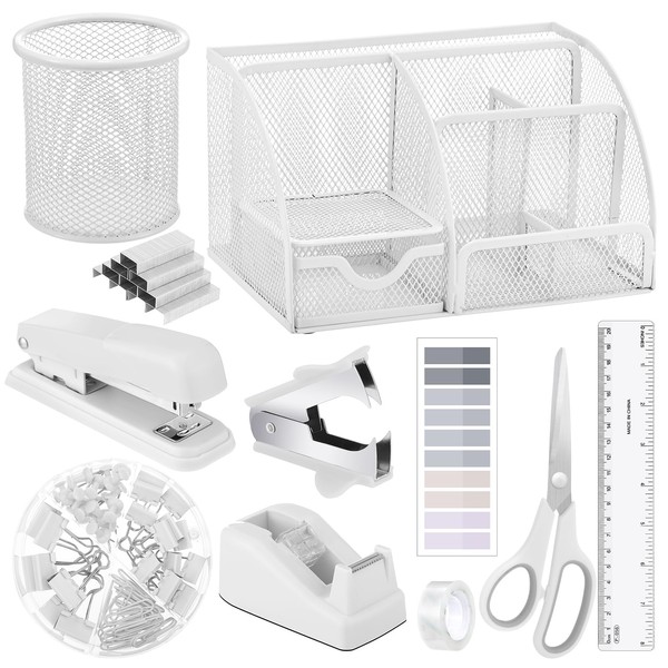 - 【Package List】You will get a set of exquisite white desk organizers and accessories, including 1 white desk organizer, 1 white stapler, 1 white tape holder, 1000pcs 24/6 staples, 1 staple remover, 1 scissors, 1 ruler, 1 pen holder, 1 tape, 1 tabs, 25 paper clips, 7 large binder clips, 13 small binder clips, and 20 thumbtacks.