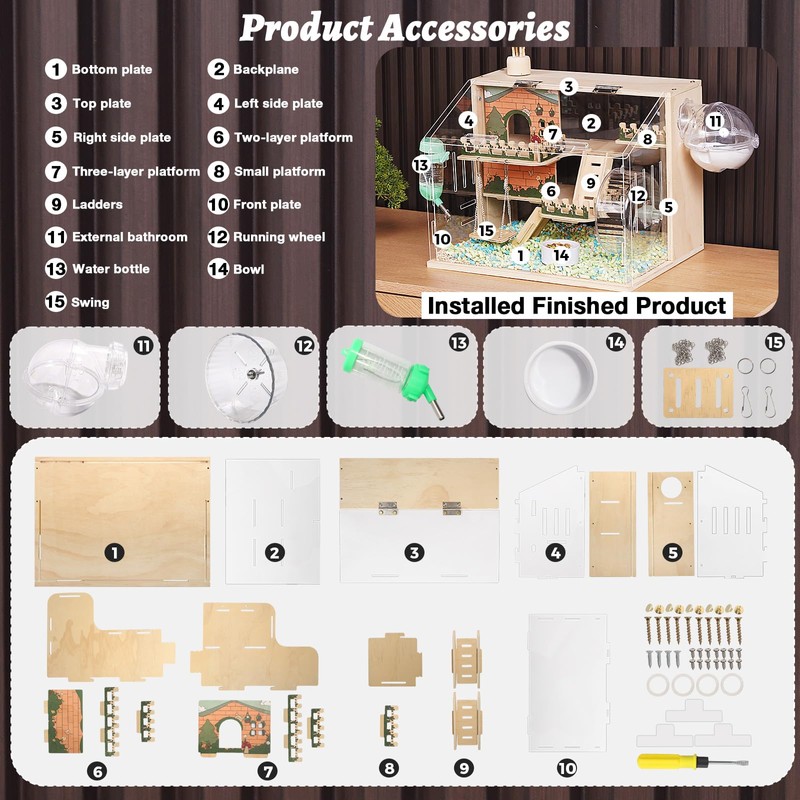 - 【Easy to Clean】 The top of the ECOCEN hamster enclosure can be opened, the acrylic plate is also assembled, and the internal stairs and railings are removable, only need to remove the front acrylic plate, take out the accessories inside can be easily cleaned.