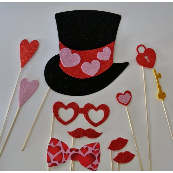 11 Pc Photo Booth Party Props Mustache on a Stick Valentines Day Hearts Top Hats