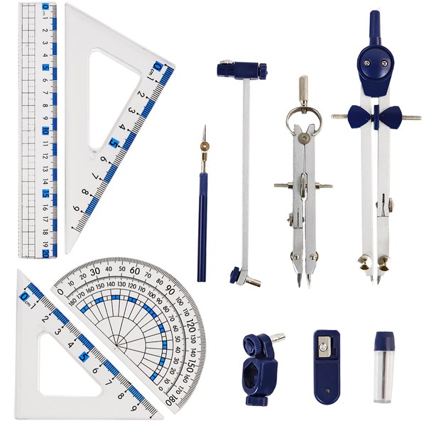 • 【Comprehensive Tool Set】Includes standard geometry set, folding compass, large compass, measuring compass, pen, refill, ruler, 2 triangle boards, protractor, to meet different drawing and measuring needs