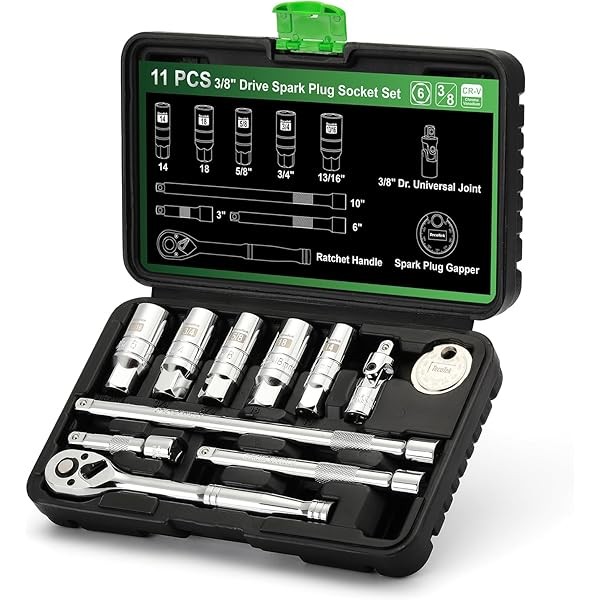 11-Piece Spark Plug Socket Set with 3/8" Drive Ratchet Handle, Spark Plug Gapper, Universal Joint and Extension Bar, 5/8", 3/4", 13/16", 14mm, 18mm, CR-V Sockets with Rubber Retaining Rings