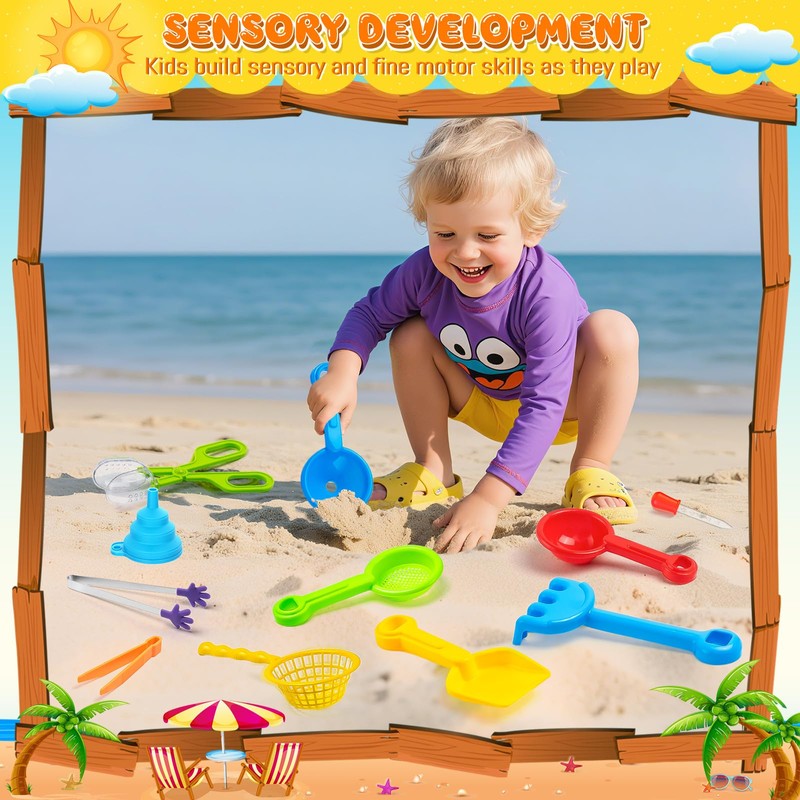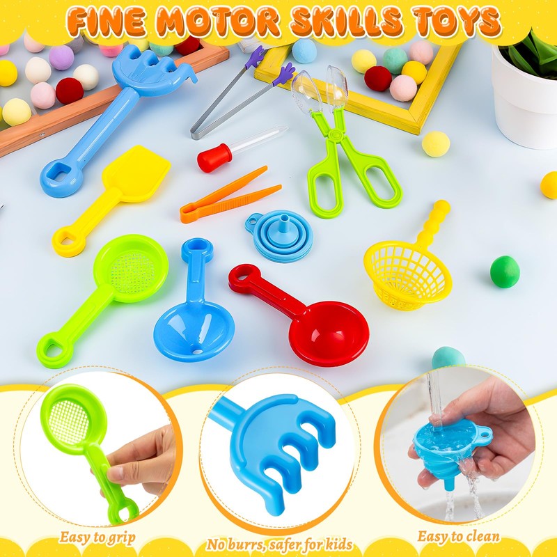 - 11 Pieces Sensory Bin Filler, Fine Motor Skills Handy Toys Set with 5 Scoops, Tweezers, Mini Silicone Tong, Scissors Clip, Dropper, Beach Shovels, Funnel, Sensory Bin Accessories Tools