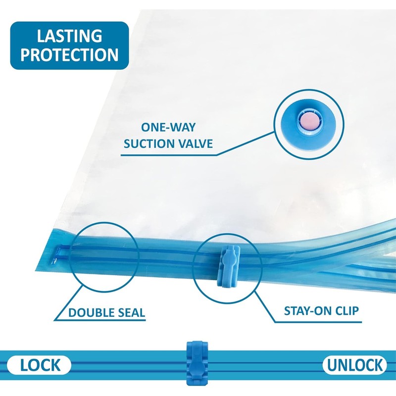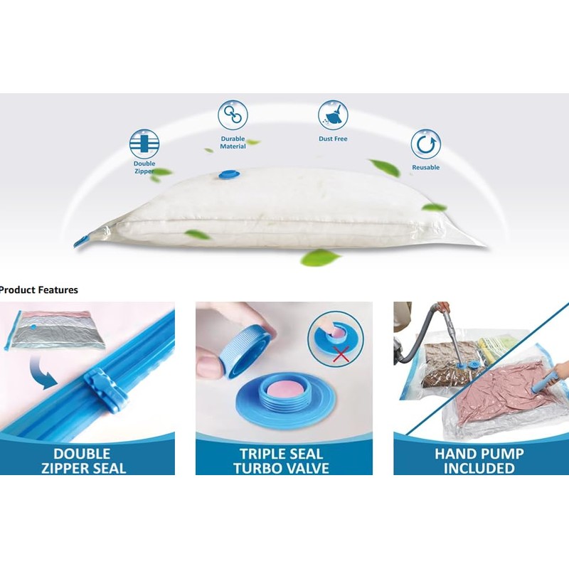 - Safety protection: Three-seal turbine valve and double zipper seal design are adopted, and our vacuum bag exhausts air during inhalation. Reusable.