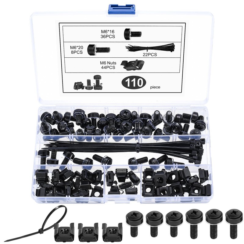 - Package Includes: 110 pcs in total, including 8 pcs m6x20mm, 36 pcs m6x16mm, 44 pcs m6 nuts, and 22 pcs cable ties, equipped with self-locking cable ties suitable for organizing, managing and storing wires in computers, home appliances and other fields