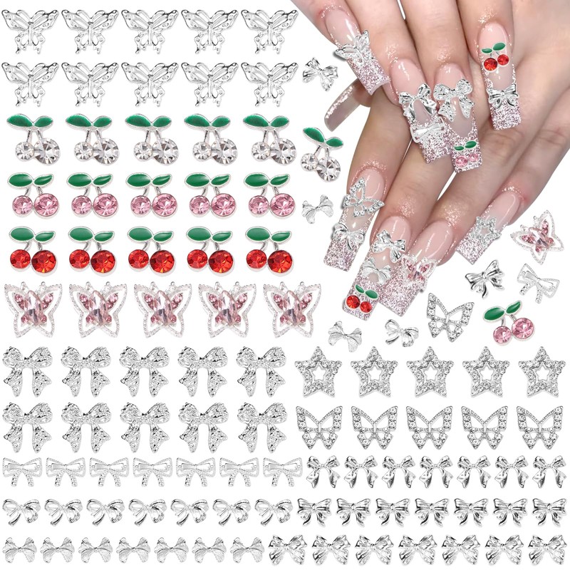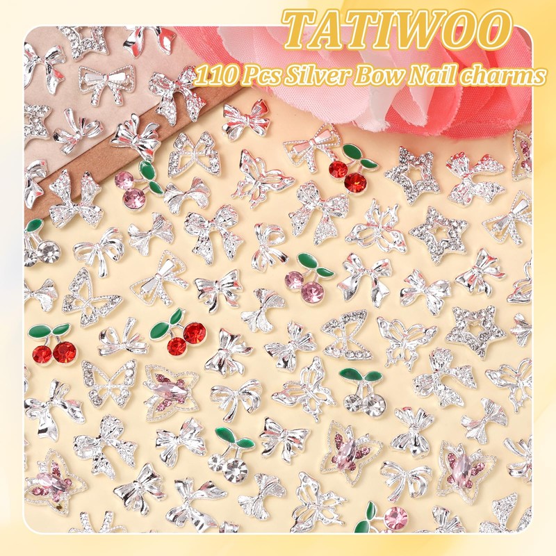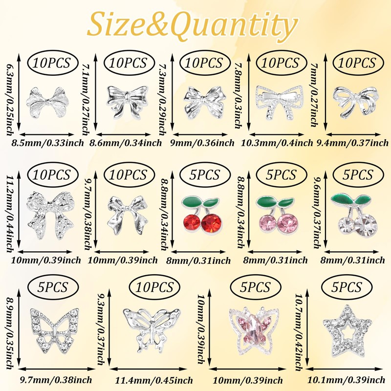 - Variety of Styles: With 110 pcs distinct styles of silver butterfly nail charms and bow cherry nail art charms, this nail silver charms offers a wide range of design options to suit any nail art enthusiast's preferences. From delicate and intricate designs to bold and eye-catching styles, there's something for everyone in this charming nail charms
