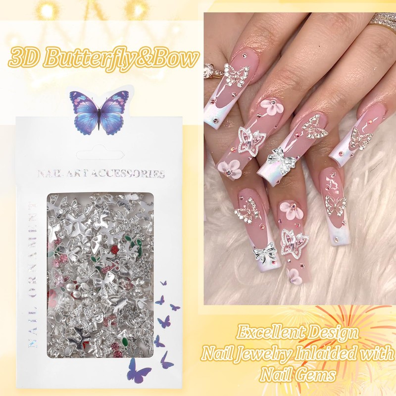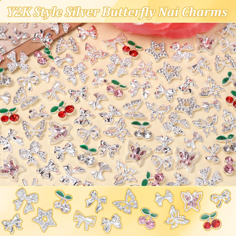 - Y2K Nail Charms: Embrace the Y2K aesthetic with these adorable 3D butterfly nail charms, star nail gems charms and mixed bow tie nail charms, reminiscent of the playful and nostalgic styles of the early 2000s. Add a touch of retro charm to your nail art looks with these shiny silver nail charms and mixed butterflies nail charms