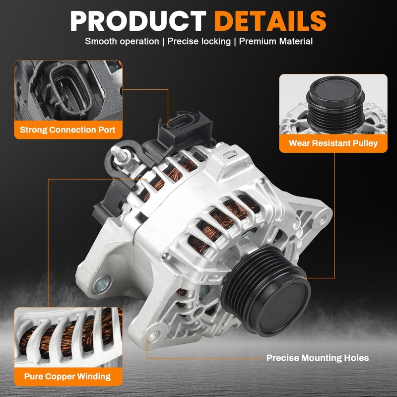 - [Vehicle Fitment]: Alternator Compatible with Kia Forte Koup L4 1.6L 2014-2016, Forte5 L4 1.6L 2015-2016, Rio L4 1.6L 2012-2017, Soul L4 1.6L 2012-2013 ( Without Start/Stop Feature ), Soul L4 1.6L 2014-2016; Compatible with Hyundai Veloster L4 1.6L Turbocharged 2013-2017, Veloster L4 1.6L Naturally Aspirated 2012-2017, Accent L4 1.6L 1591cc 97cid 2012-2017