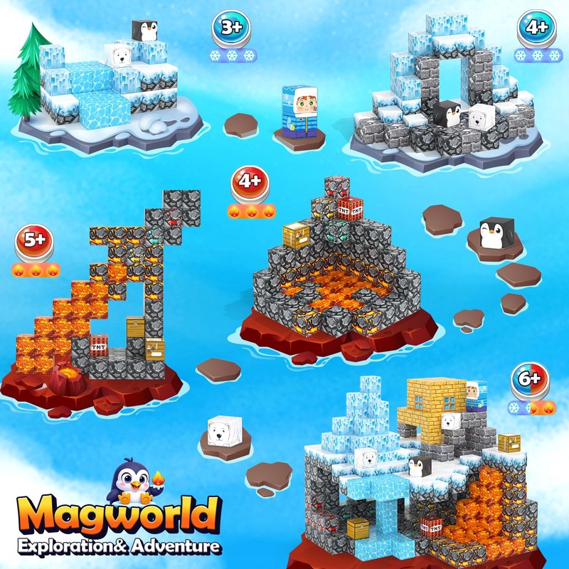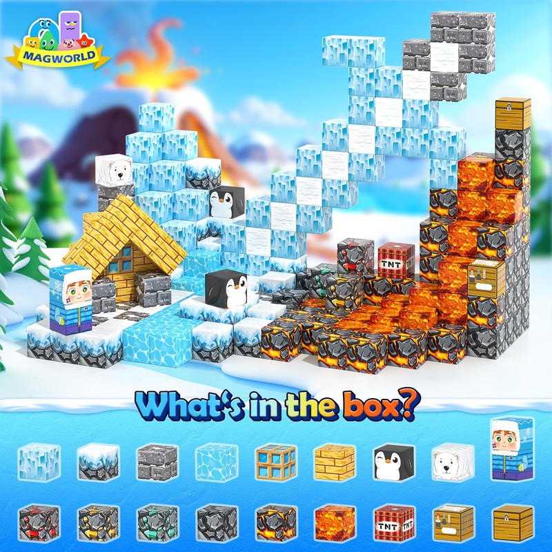 - 【UNLEASH THE EPIC WORLD】 Dive into the NEW Ice and Fire World Magnetic Blocks Set and expand your MAGWORLD universe! Unearth glowing crystals near a fiery volcano, conquer building challenges, and spark epic adventures. Ready to craft your own magnetic masterpiece? Let the quest begin!