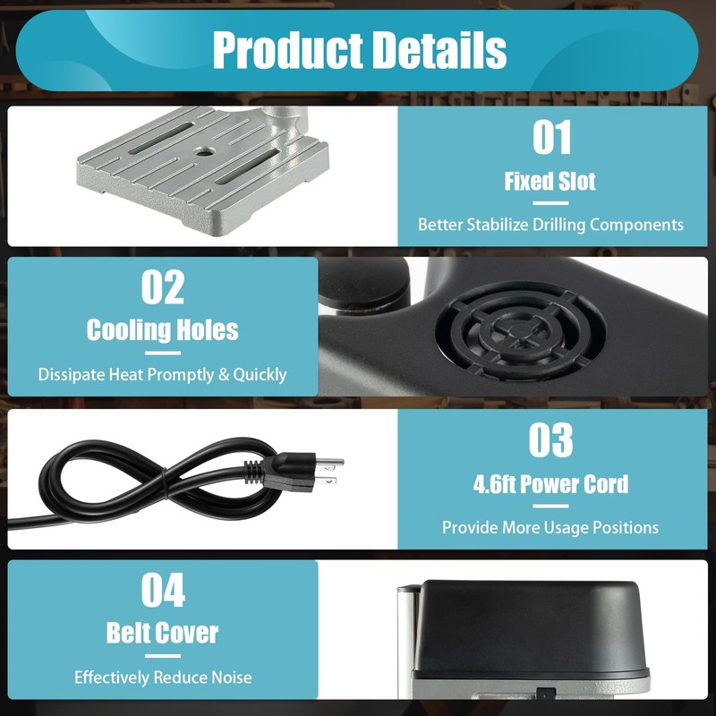 - High Quality The mini benchtop drill press adopts full copper wire motor and cast iron base,The breakage rate of the drill bit is low, and the whole machine runs smoothly and has a long service life,taladro de banco Low Noise Since it uses a full copper motor, it will minimize the noise when the machine is running.