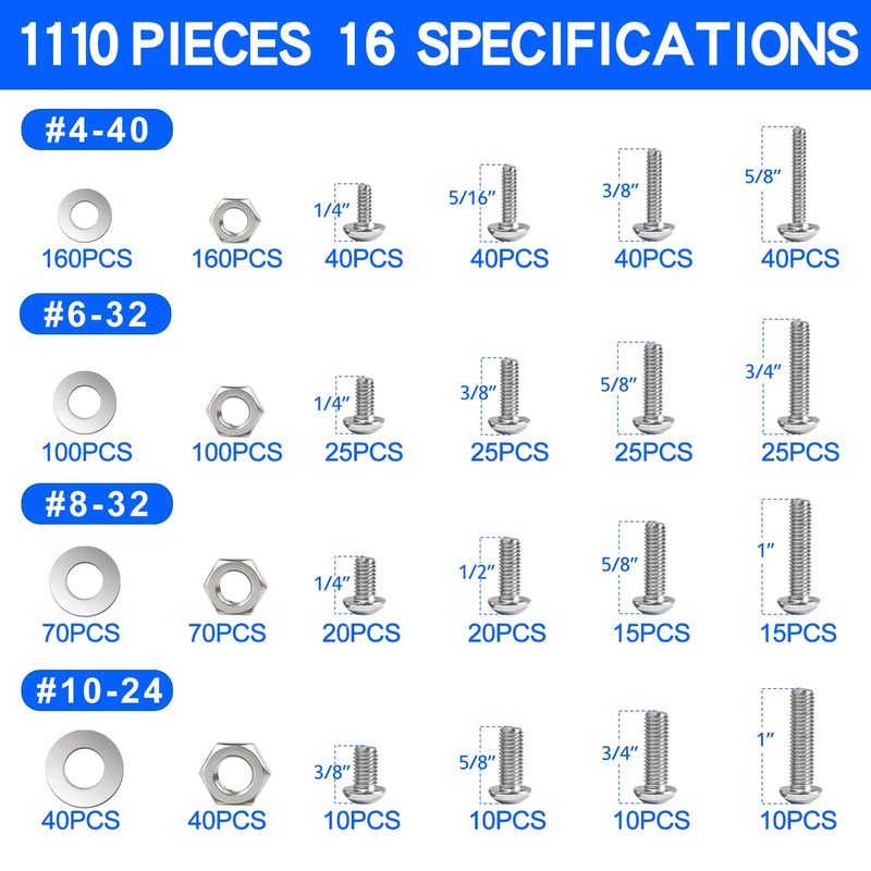 - 【1110PCS Hardware Assortment】You will get: A variety of lengths of #4, #6, #8 and #10 pan head screws, Phillips screws, washers and nuts in ample quantities for durability.