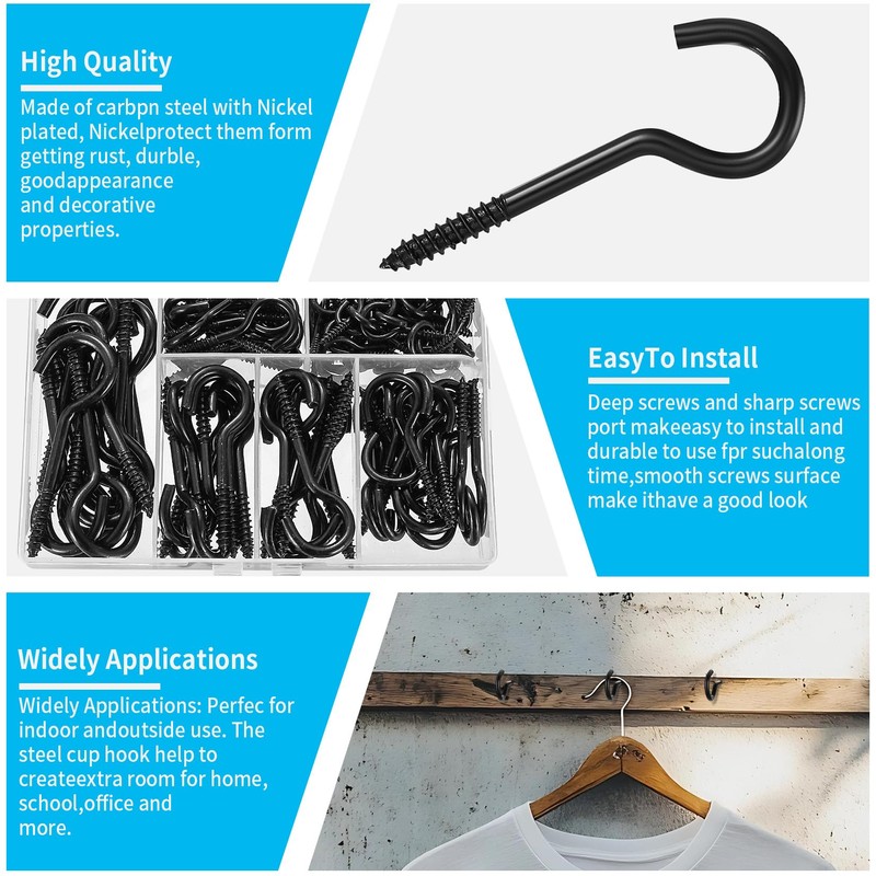 1. The cup hooks are made of carbon steel, the surface is smooth and burr-free, corrosion-resistant, not easy to break and durable.
