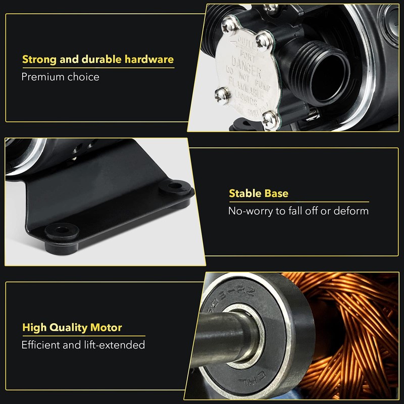 - POWERFUL: Large lifting capacity. Transfer water up to 330 GPH and the maximum head up to 44ft, remove water down to 1/8 inch of surface.