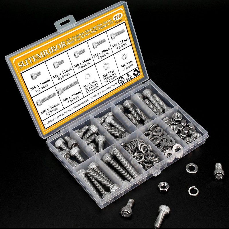 - √ Package Included: 118 pieces Sutemribor M6 x 10/12/16/20/25/30/35mm hex socket head cap screws nuts washers are packaged in a clear plastic box, we put screws nuts washers in 10 grids, each size is marked with a clear label, which is very convenient for you to carry and use. If you have any questions, please free to contact with us and we will reply to you as soon as possible.