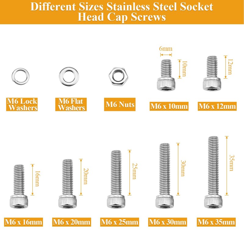 - √ Dimension: Total 118 pieces M6 x 10/12/16/20/25/30/35mm hex socket head cap screws with matching nuts, lock washers and flat washers, different sizes and enough quantities can meet your different daily needs.