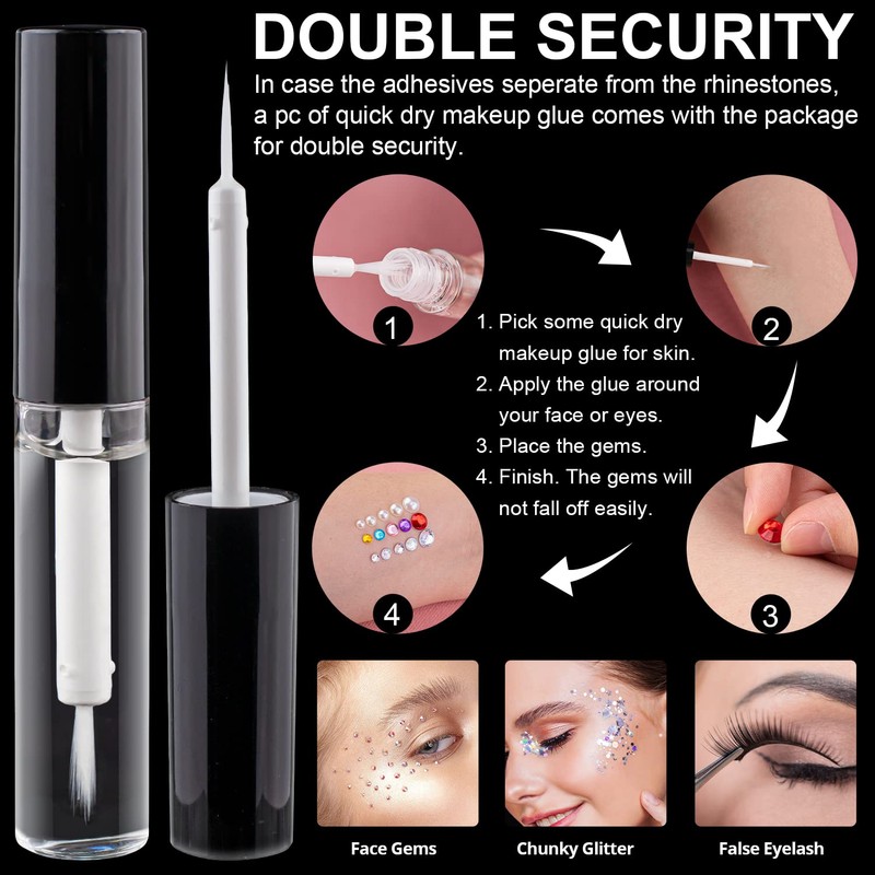 - ✨QUICK DRY MAKEUP GLUE -- For double secure, 1 pc of quick dry makeup glue will come with the package. In case the pearls get apart from the self adhersive tape, you can apply the makeup glue on your face or body to stick the pearls.