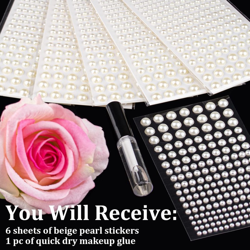 - ✨PACKAGE CONTAINS -- You will receive 6 sheets of BEIGE half round pearl stickers with 5 sizes(3/4/5/6/8mm); And 1 pc of quick dry makeup glue.